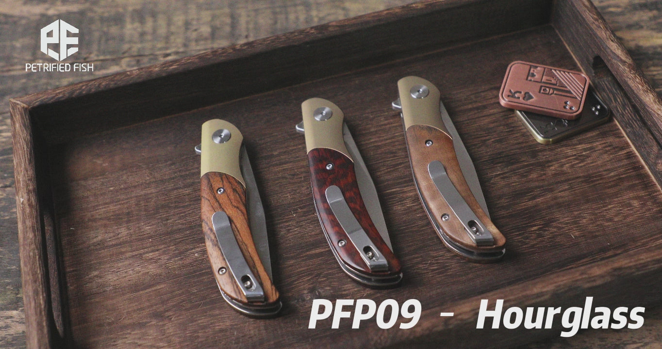 Petrified Fish PFP09 Hourglass ,3.54" K110 Satin Blade, 110g Wood Handle Flipper Liner lock Folding knife